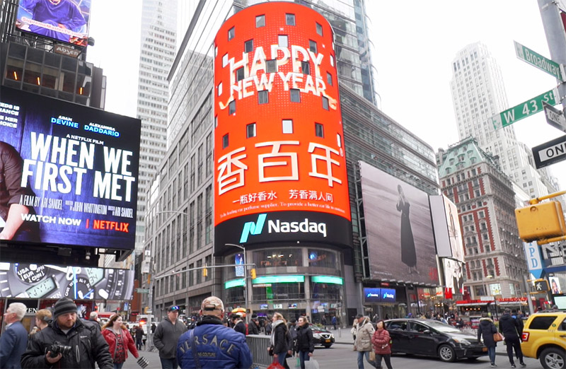 香百年作為民族品牌香薰,多年來一直受到大家的支持與關注,借著此次舉國騰歡的春節,通過納斯達克戶外大屏這個窗口,向全世界人民拜年賀春,祝福各國的朋友們新年快樂,祝愿你們在2018年都有一個嶄新的開始。